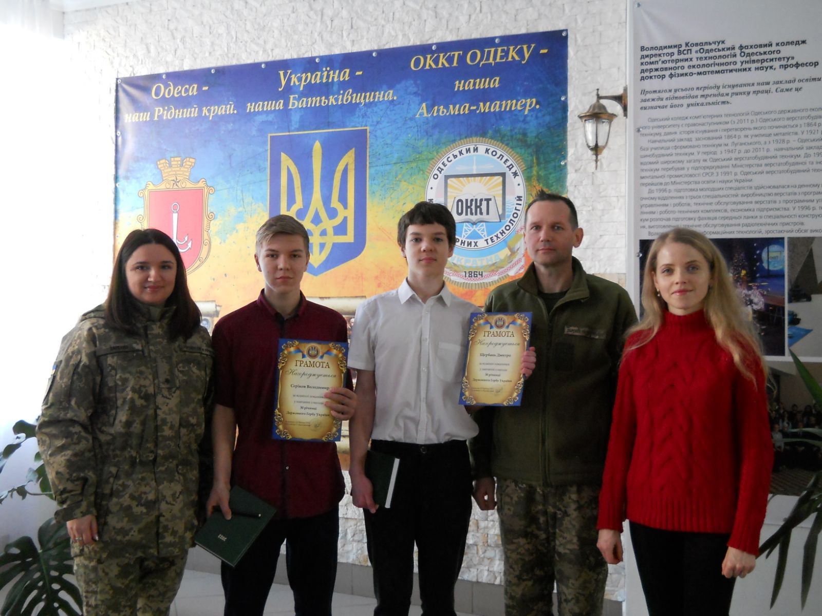 З нагоди 30-ї річниці Державного Гербу України від імени Командування 122 бригади ТрО нагородили грамотами студентів ВСП «Одеський фаховий коледж комп’ютерних технологій Одеського державного екологічного університету», які показали за час навчання відмінні показники у вивченні дисципліни «ЗАХИСТ УКРАЇНИ».
