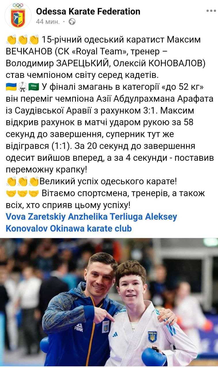 Вітаємо чемпіона світу! Вітаємо! Наш студент 1 курсу Вечканов Максим Андрійович( група 24 ПР2) став чемпіоном світу серед кадетів! Великий успіх одеського карате! Перша золота медаль українського карате на чемпіонаті світу-2024! Наша гордість! OKKT2024-10-16T15:45:49+03:00