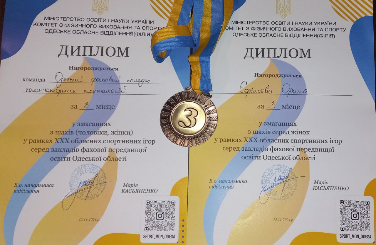 У рамках XXX обласних спортивних ігор серед закладів фахової передвищої освіти Одещини відбулися змагання з шахів, у яких взяли участь і студенти Одеського фахового коледжу комп’ютерних технологій Єфімова Орина ( гр.22Д) та Партолюк Гліб ( гр.23ТТ1). Завдяки високій майстерності наша студентка Єфімова Орина здобула почесне третє місце. Команда нашого навчального закладу коледжу отримала диплом за 3 місце. Вітаємо та бажаємо нових успіхів у майбутніх змаганнях!