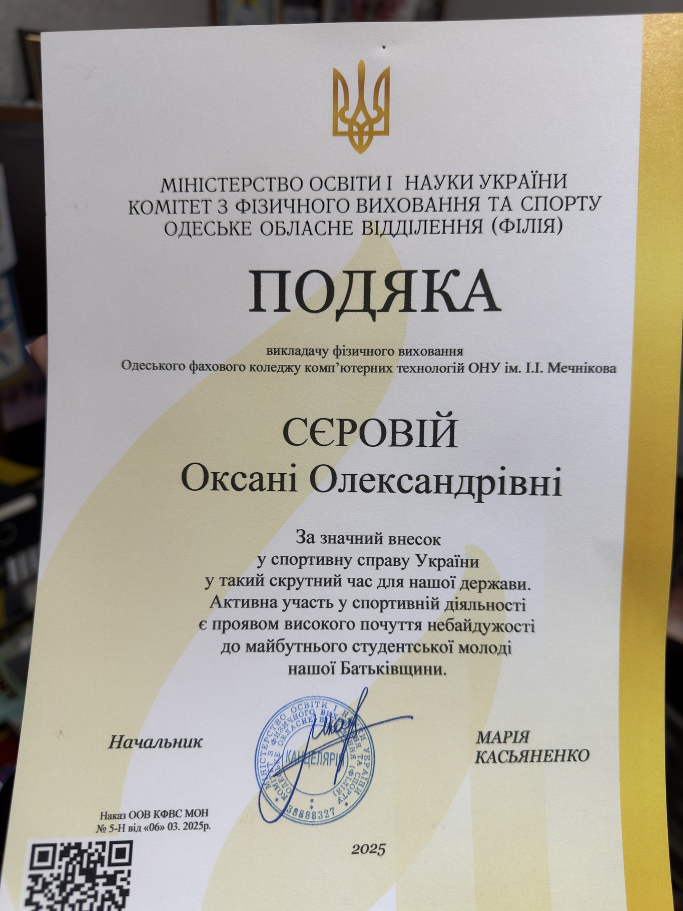 Дякуємо викладачам фізичної культури Лопатюк Д.С., Сєровій О.О., Альошину В.А. за значний внесок у спортивну справу України, активну участь у спортивній діяльності , підготовку та проведення змагань!