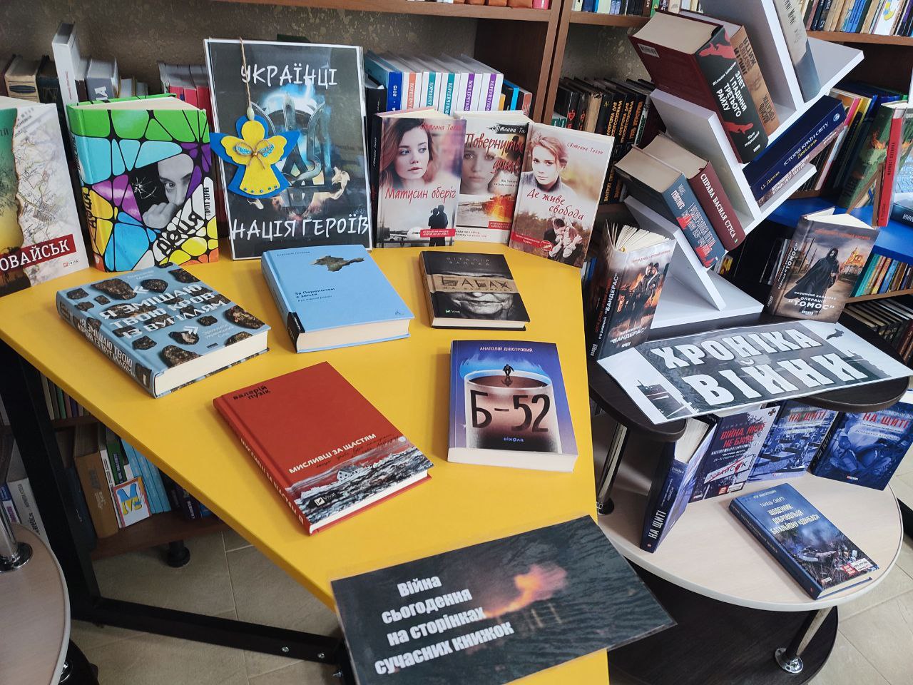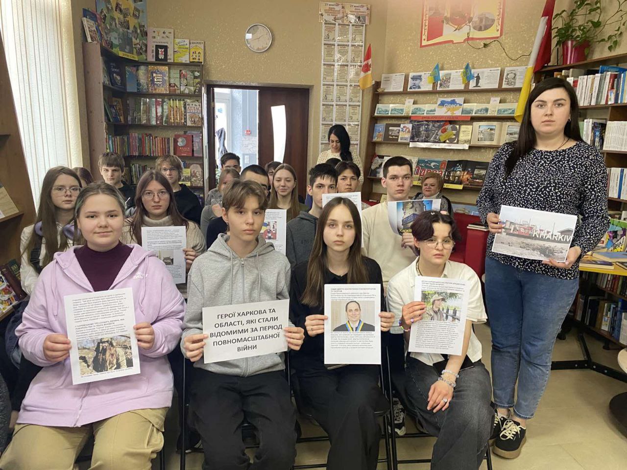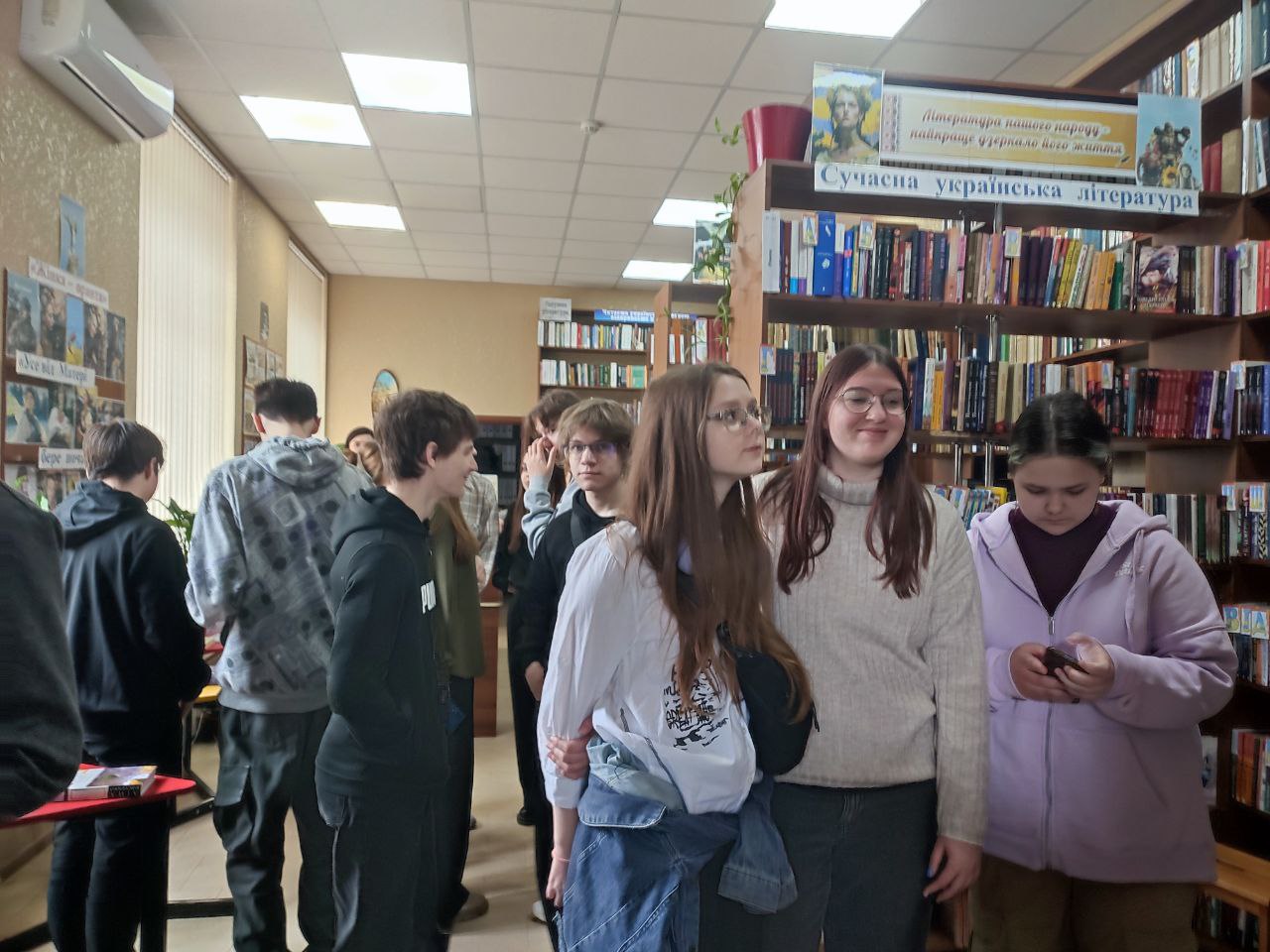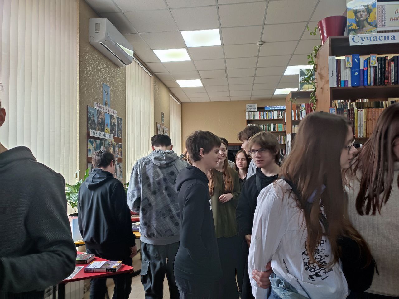 На початку зустрічі бібліотекарі провели екскурсію закладом та ознайомили із сучасною літературою про війну, яка була написана за останні 10 років. Книги Віталія Запеки, Сергія Жадана, Ірини Говорухи, Валерія Пузіка та інших сучасних авторів наповнювали виставки книг “Ні – жахливій війні!”, “Українці – нація героїв”,”Хроніка війни”, «Харків вистоїть! Віримо! Знаємо!», «Україна – країна незламних людей», «Війна сьогодення на сторінках сучасних книжок».