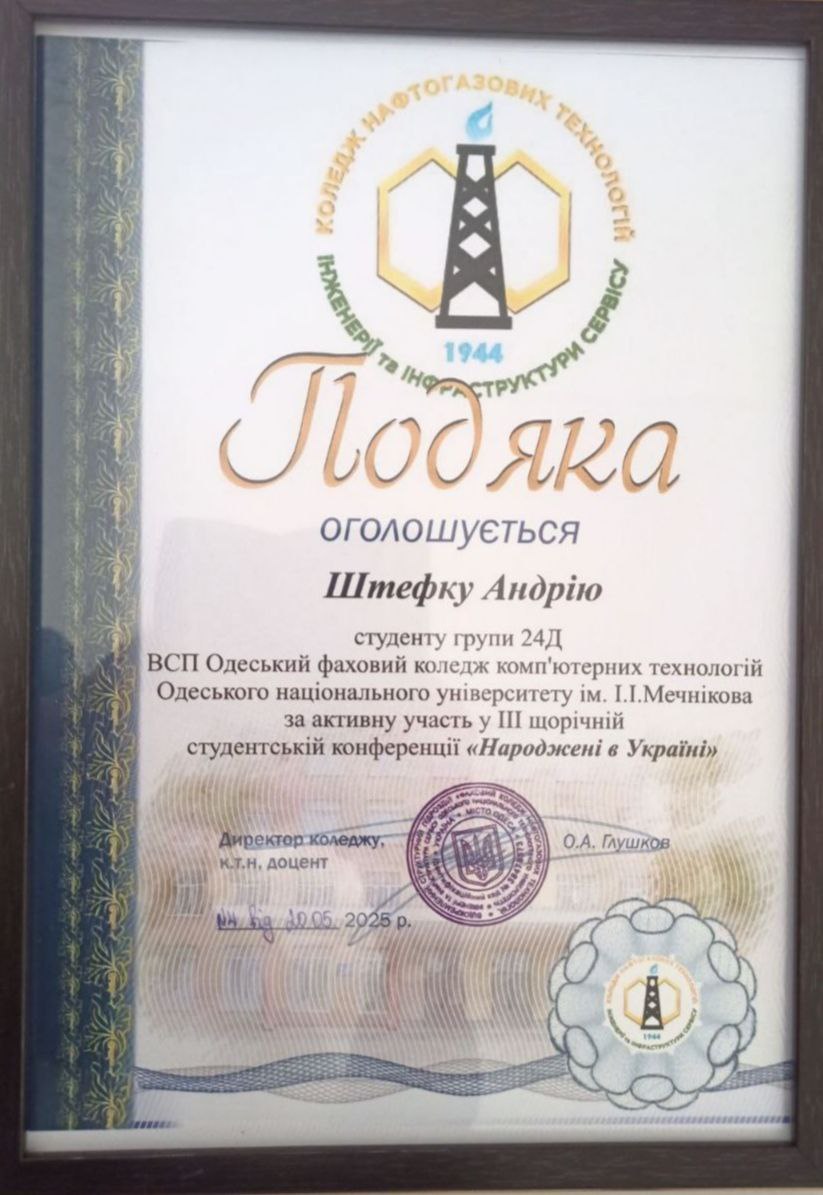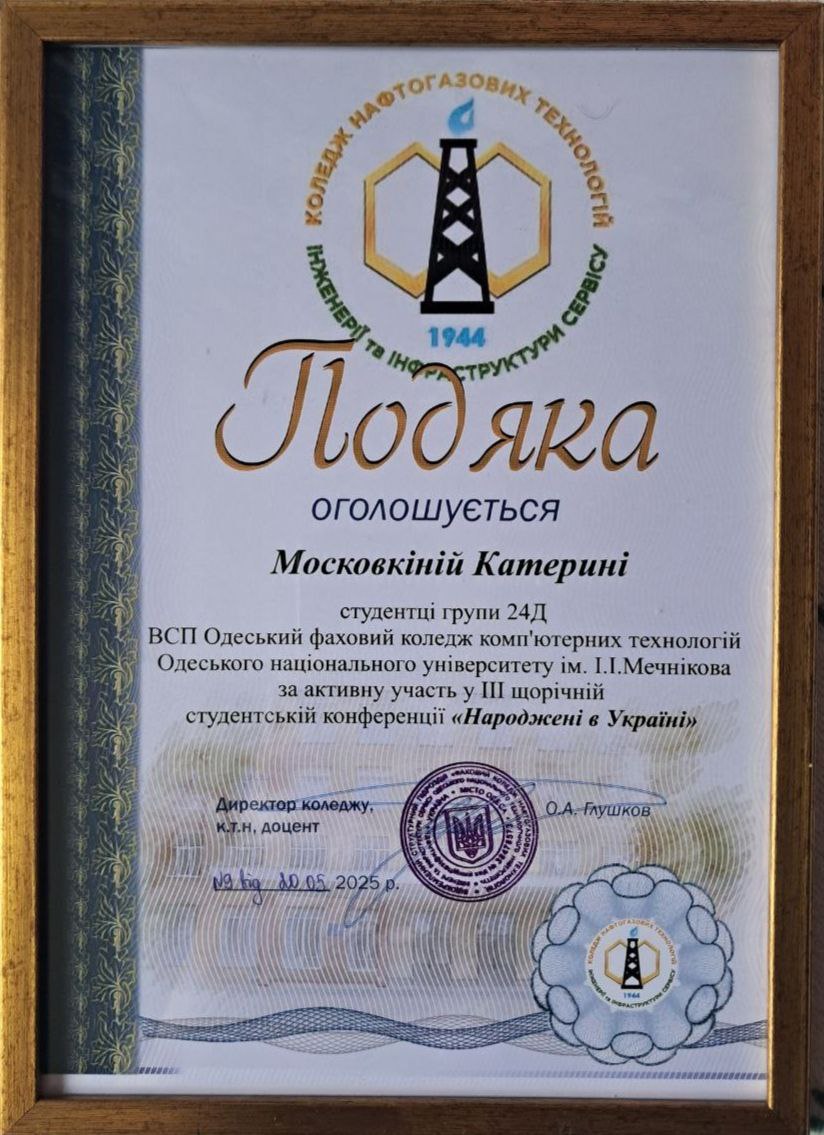 Вітаємо здобувачів освіти Одеського фахового коледжу комп’ютерних технологій ОНУ ім. І. І. Мечникова 1 курсу групи 24 Д Штефка Андрія та Московкіну Катерину, які взяли активну участь у III щорічній студентській конференції “Народжені в Україні” та проявили свою творчу майстерність та ерудованість, досліджуючи сучасну українську музику, а саме рок. На прикладі гуртів “Скрябін”, “Жадан і Собаки” студенти показали учасникам конференції як впливає музика на українське суспільство та культуру. Дякуємо викладачу історії України Кучеренку Юрію Анатолійовичу за плідну підготовку студентів!