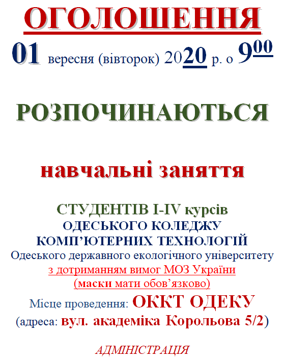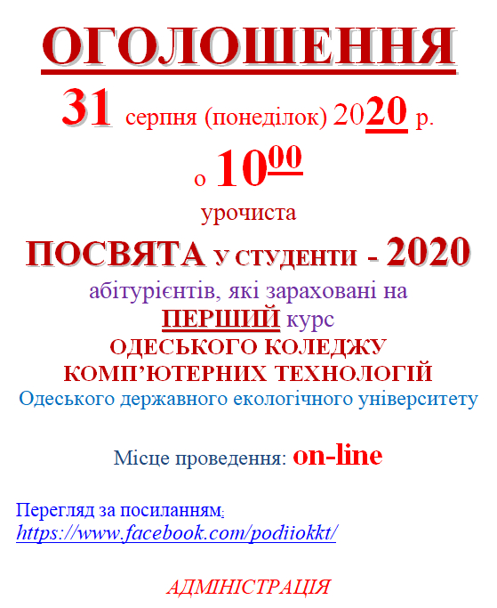 OKKT2022-08-10T14:01:36+03:0030 серпня 2021 року у стінах коледжу відбулася урочиста посвята в першокурсники. Емоційно щасливі та водночас стривожені колишні учні отримали звання студента. Родину коледжу поповнили 292 амбітних, цілеспрямованих молодих людей. З вітальним словом до першокурсників звернувся директор коледжу Ковальчук В. В., який розповів про славний шлях та вікову історію навчального закладу та побажав першокурсникам бути наполегливими в отриманні знань та примножувати славу коледжу. Студенти, які вступили до [...]